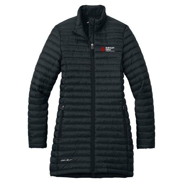 Designed with traditional quilt lines, this insulated full-zip is built for warmth and weather-resistant performance Features include full-length interior storm flap with chin guard, exposed, molded zippers with Eddie Bauer logo pulls, elastic cuffs, zippered hand pockets and a slight drop tail hem Includes an embroidery access pocket Packs into zippered left hand pocket Longer length with a double zipper Contrast Eddie Bauer heat transfer logo on right hem Made of 100% polyester ripstop and 5.4-ounce, 100% polyester blown fill PU coating on back of shell Durable water-repellent (DWR) finish.