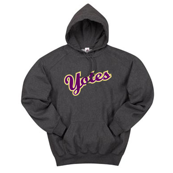 College of Idaho Yotes Heavyweight Hoody 12 oz., 60% sueded ringspun cotton/40% polyester hooded sweatshirt. Two-ply lined hood with matching drawstring. Rib side panel insert. Spandex reinforced rib knit cuffs and waistband. Low pilling. Front pouch pocket. Badger Sport shoulder panels allow room for movement. Athletic cut. Embroidered Badger logo on left sleeve cuff Decoration: Screen-Printed