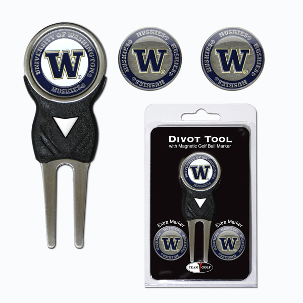 This University of Washington Divot tool pack comes with an antiqued brass tool with clip and extra small marker on the back. Pack also includes 3 double sided enamel color fill markers.