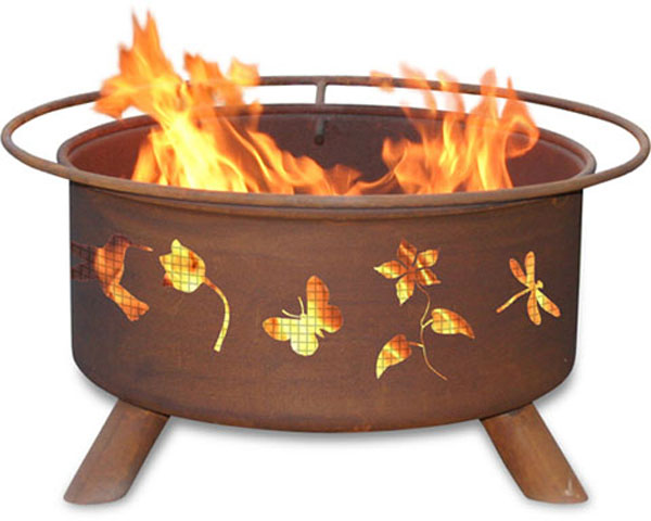 This Flower Garden fire pit is supported by three sturdy legs, welded in place to prevent the pit from wobbling. For safety, the fire pit includes a spark screen, which can be easily removed with the poker (pit hook). Every fire pit comes with this poker and a barbeque grill for easy outdoor grilling. Its portable design allows you to easily take your fire pit from the deck or patio to the beach or to your favorite camping spot. This natural rust patina fire pit comes fully assembled and has a 5- year warranty on the fire pit.