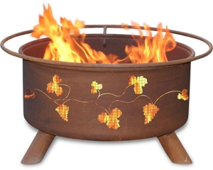 This Grape Vine fire pit is supported by three sturdy legs, welded in place to prevent the pit from wobbling. For safety, the fire pit includes a spark screen, which can be easily removed with the poker (pit hook). Every fire pit comes with this poker and a barbeque grill for easy outdoor grilling. Its portable design allows you to easily take your fire pit from the deck or patio to the beach or to your favorite camping spot. This natural rust patina fire pit comes fully assembled and has a 5- year warranty on the fire pit.