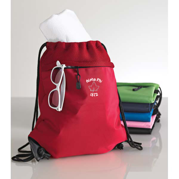 Just right for the beach or by the pool, this large Alpha Phi cinch pack will hold shoes or clothes with ease.