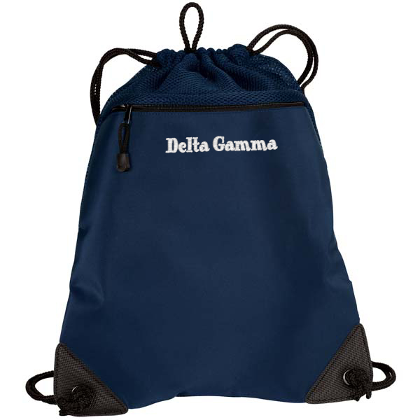 Just right for the beach or by the pool, this large Delta Gamma cinch pack will hold shoes or clothes with ease.