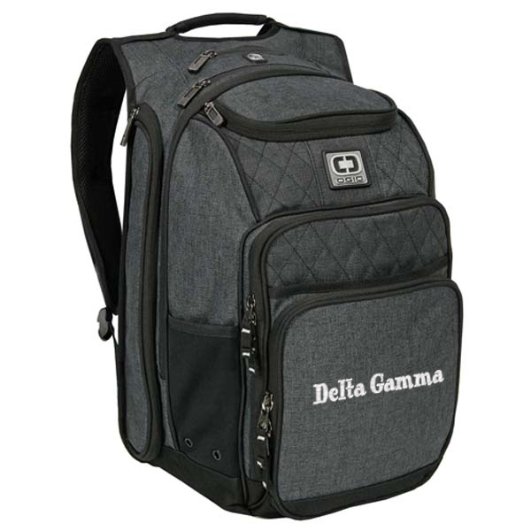 Beyond a backpack, this Delta Gamma hold-all is a tech organizer with ingenious compartments and sleeves for gadgets, laptop, cords and more.