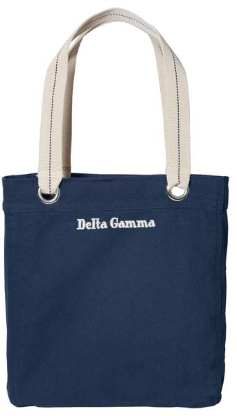 Shopping, commuting or sightseeing, Allie is your companion. Contrast lining, striped handles and large metal grommets add a touch of whimsy to this Delta Gamma casual tote. The open-top design offers easy access to books, papers or camera. An interior zippered pocket keeps keys and small essentials secure.