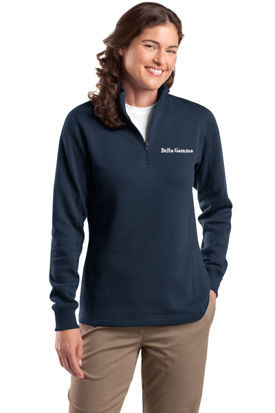 A stylish feminine fit and flatlock stitching details make this new Delta Gamma sweatshirt stand out. A rib knit cadet collar and 1/4-zip add to its appeal. Colorfast with minimal shrinkage, this casual essential is made to last.