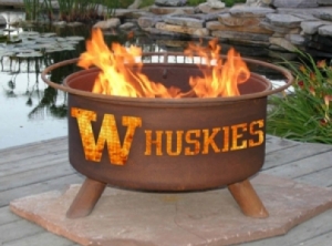 This University of Washington fire pit is supported by three sturdy legs, welded in place to prevent the UW Husky fire pit from wobbling. For safety, the Washington Husky fire pit includes a spark screen, which can be easily removed with the poker (pit hook). Every UW fire pit comes with this poker and a barbeque grill for easy outdoor grilling. Its portable design allows you to easily take your UW Husky fire pit from the deck or patio to the beach or to your favorite camping spot. This natural rust patina Washington fire pit comes fully assembled and has a 5- year warranty on the University of Washington fire pit.