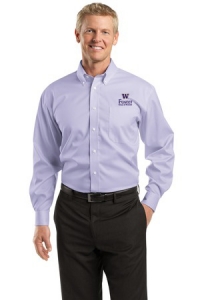 A dobby weave gives this UW Foster School of Business well-mannered shirt subtle texture and a slight sheen. Woven with 80-doubles yarn, this 100% two-ply cotton shirt is specially treated to resist wrinkles and remain looking crisp. Single-needle tailoring, button-down collar and patch pocket. Red House engraved buttons and embroidery on the right sleeve placket.